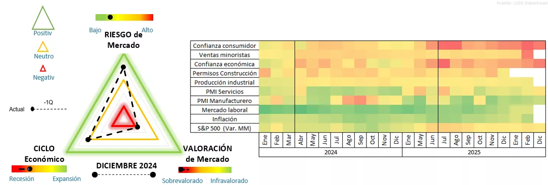 El entorno técnico y macroeconómico sugiere que los mercados norteamericanos han sobreextendido su rally. Con un GVC Momentum en zona de exuberancia extrema y un GVC Risk anclado en mínimos, es probable que enero marque una fase de consolidación o corrección moderada, particularmente si los datos de empleo o inflación sorprenden al alza.